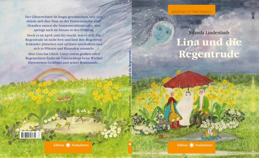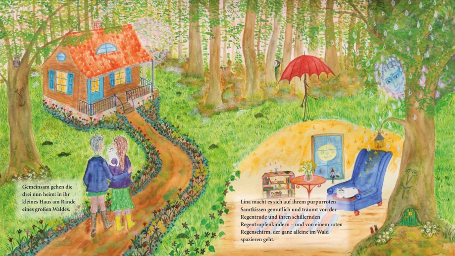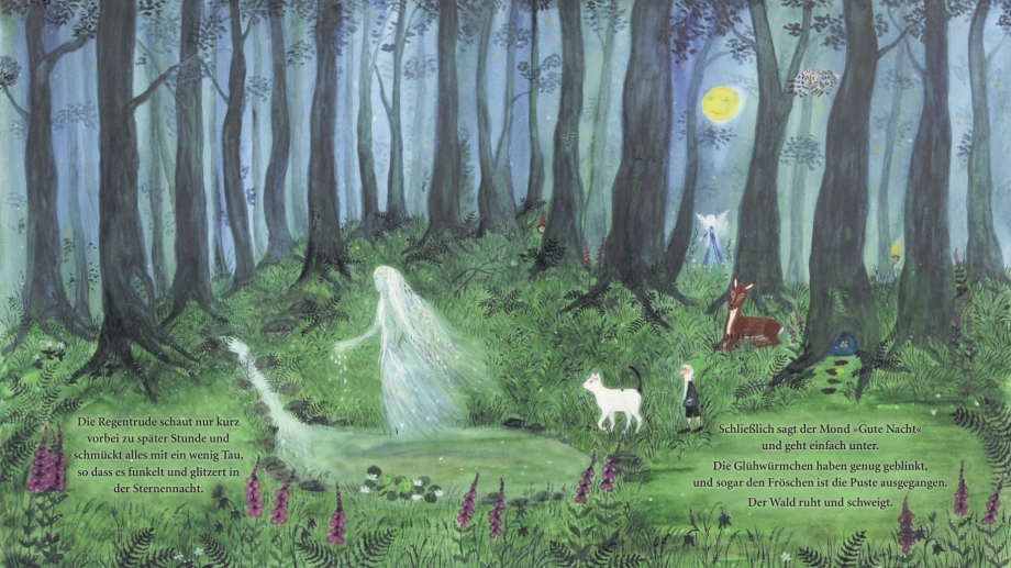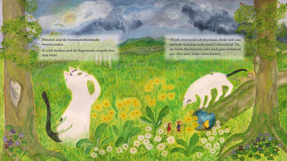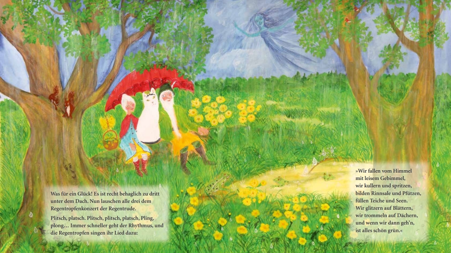 Zusammen mit Hieronymus und Rosamunde lauscht sie dem Konzert der Regentropfen und bewundert den famosen Regenbogen, den die Regentrude mit Hilfe der Sonne an den Himmel zaubert.