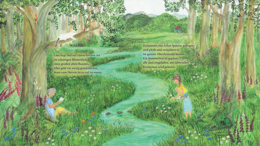 Da kommt eine Schar Spatzen geflogen und zwitschert und trällert es im ganzen Märchenwald herum: Ein Sommerfest ist geplant; um zahlreiches Erscheinen wird gebeten.
